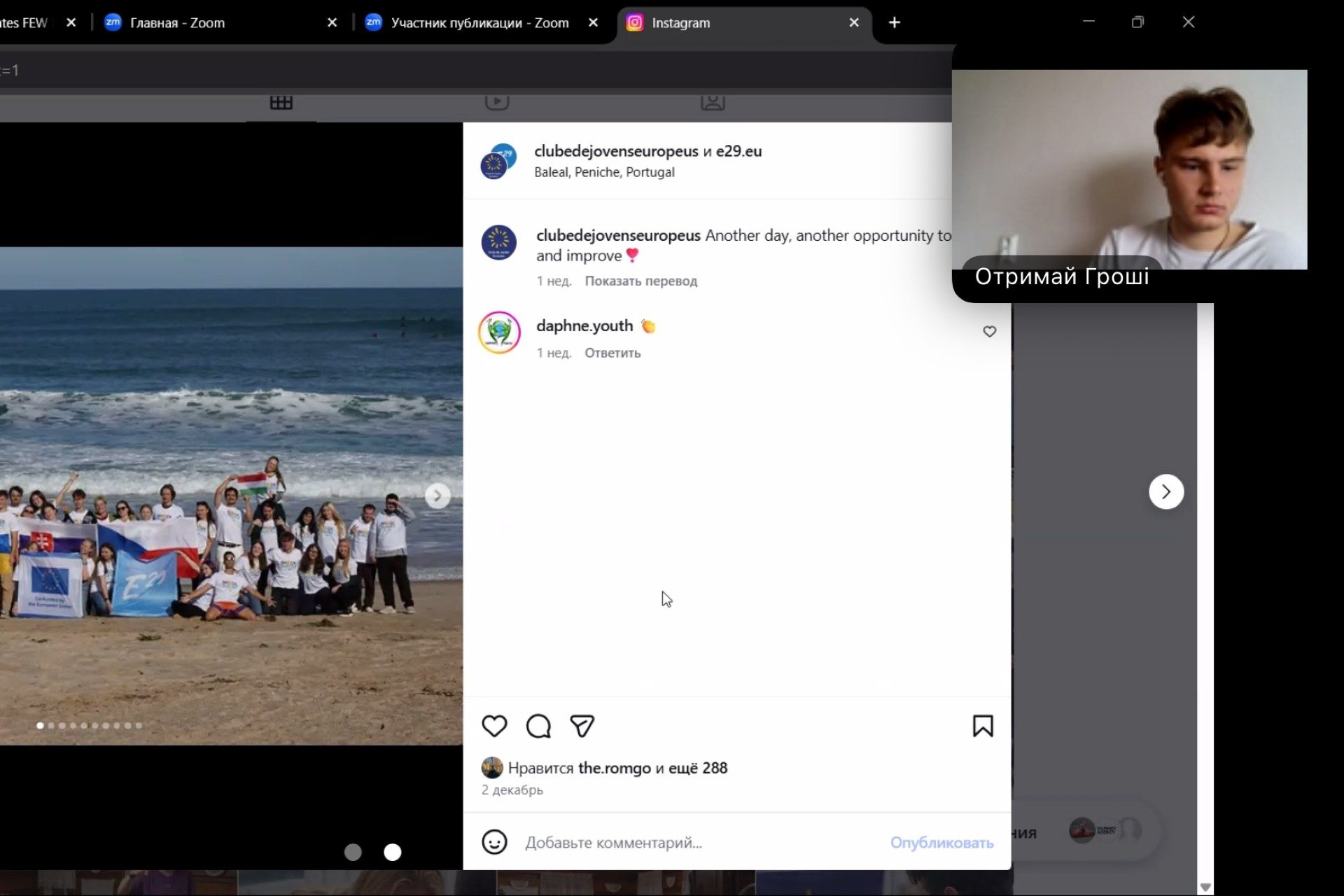 Dissemination held by Roman Khuda at Lviv National University of Ivan Franko, for 22 people. He held a Zoom call with his classmates, during which he introduced the E29 organization, presented the opportunities it offers, and explained how to apply for its activities.